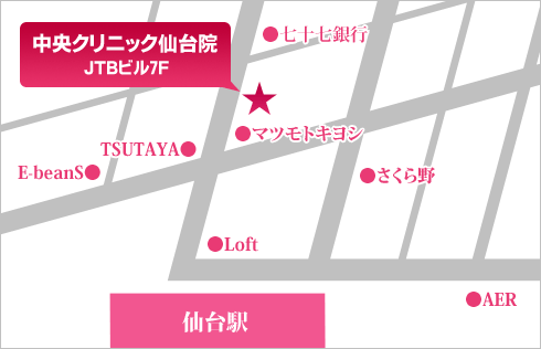 JR 仙台駅より徒歩 2 分 仙台駅西口4番、5番出口を出ると、目の前に黄色の LoFt の看板が見えます。 目線を左側にずらしますと後方に 紺色の 東北文化学園大学、大学院、東北文化学園専門学校 の看板が見えてきます。 「東北文化学園大学」の奥に 赤色の JTB の看板が見えます。そのJTBビル 7 階です。看板を見ていただくと簡単に分かりますが、もし分からないようでしたら 022-724-1401 にお電話下さい。 |